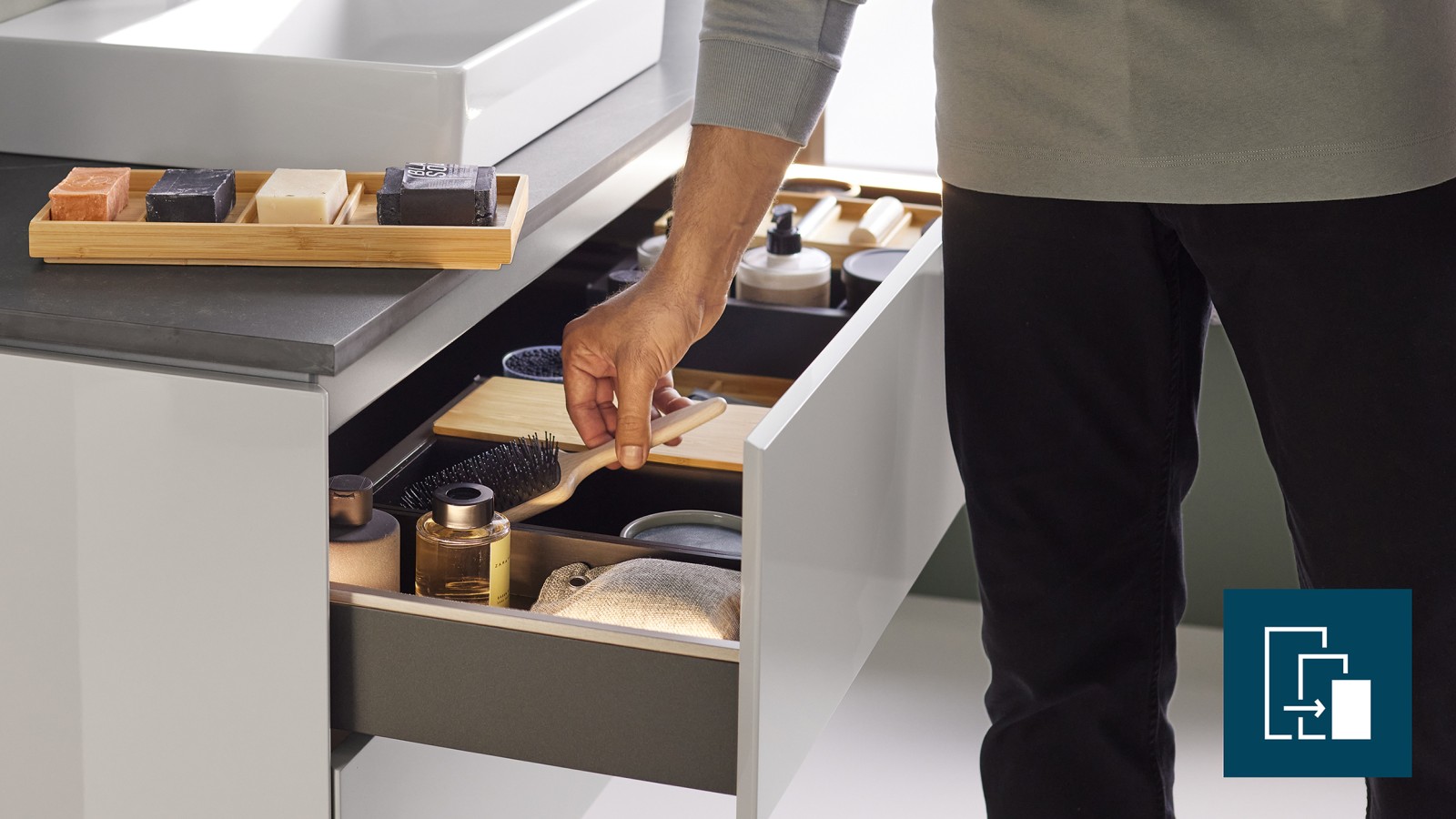 What’s inside matters too! Bathroom essentials can be neatly stowed away in storage boxes and organisers in the drawer. For the Geberit ONE, Geberit Acanto and Geberit iCon bathroom series, there is a modular organisation system with bamboo- and lava-coloured insert compartments. The modular sets are optimised for every drawer width and are available as options.